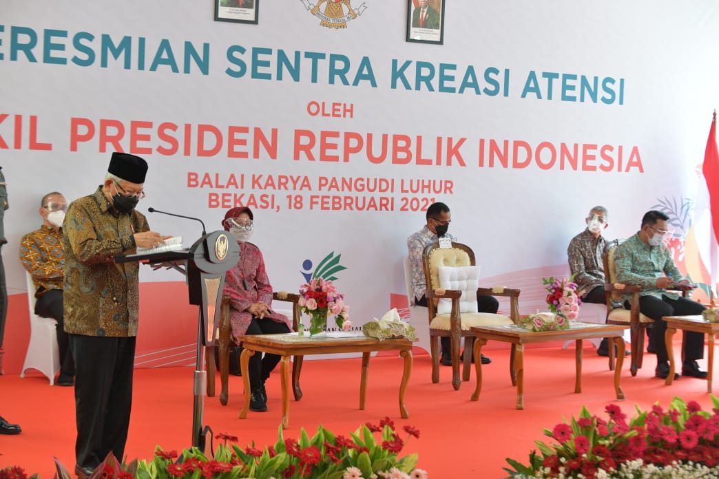 (Vibizmedia – Bekasi) Wakil Presiden Republik Indonesia, Ma’ruf Amin meresmikan Sentra Kreasi Asistensi Rehabilitasi Sosial (ATENSI) di Balai Karya Pangudi Luhur Bekasi milik Kementerian Sosial RI. Sentra Kreasi ATENSI merupakan pusat pengembangan kewirausahaan dan vokasional serta media promosi hasil karya penerima manfaat dalam satu kawasan.