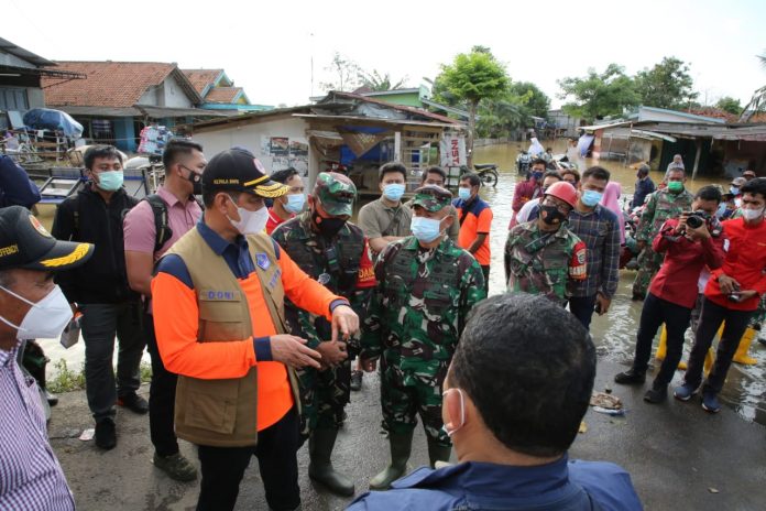 (Vibizmedia-Nasional) Kepala Badan Nasional Penanggulangan Bencana (BNPB) Doni Monardo bersama Menteri PMK Muhadjir Effendy dan Sekretaris Daerah Karawang Acep Jamhuri meninjau lokasi terdampak banjir di Desa Karangligar, Kecamatan Telukjambe, Kabupaten Karawang Barat, Minggu, 21 Februari 2021. Dalam peninjauan tersebut, Doni Monardo beserta rombongan melihat langsung giat penanganan banjir yang dipicu curah hujan tinggi dan meluapnya Sungai Ciseet, Sungai Citarum, dan Kali Cimalaya sejak Minggu, 7 Februari 2021.