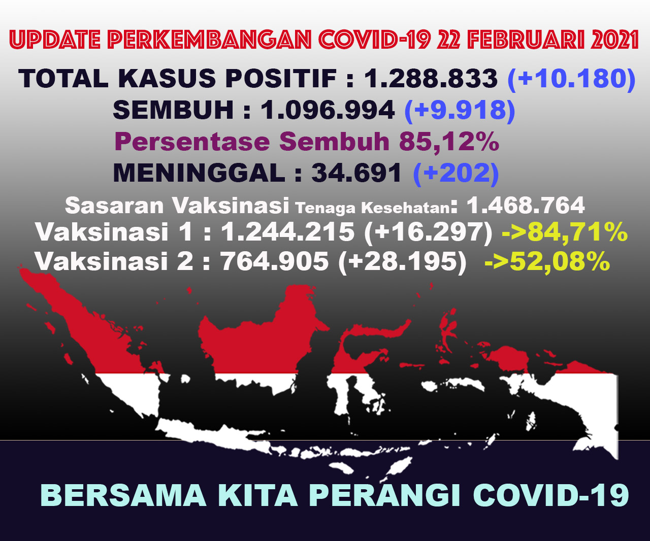 (Vibizmedia – Nasional) Berikut adalah angka akumulatif perkembangan data kasus Covid-19 dari seluruh Indonesia hingga tanggal 22 Februari 2021.