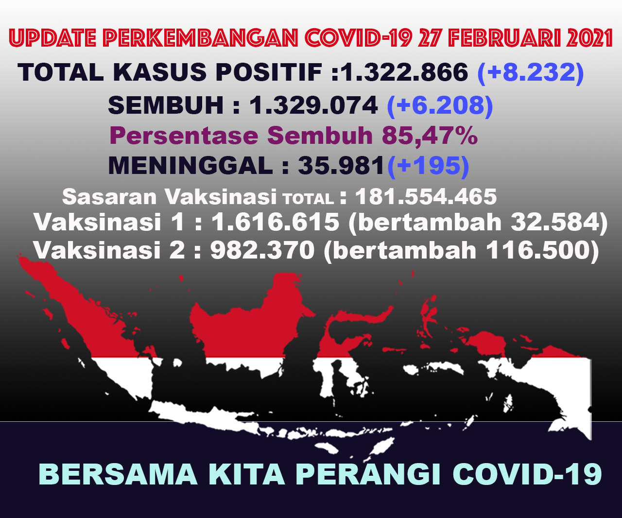 (Vibizmedia – Nasional) Berikut adalah angka akumulatif perkembangan data kasus Covid-19 dari seluruh Indonesia hingga tanggal 27 Februari 2021.