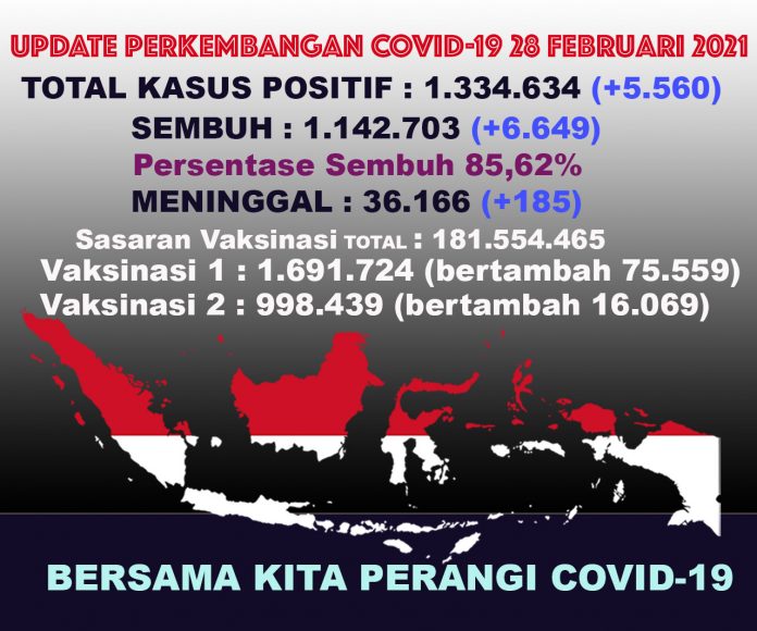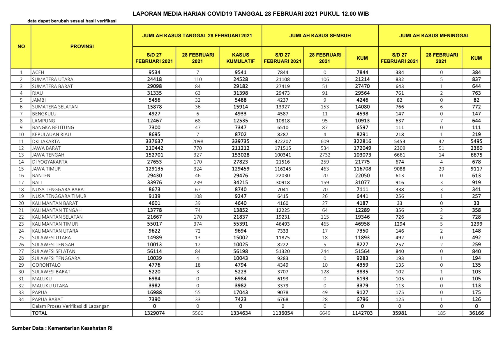 (Vibizmedia – Nasional) Berikut adalah angka akumulatif perkembangan data kasus Covid-19 dari seluruh Indonesia hingga tanggal 28 Februari 2021.