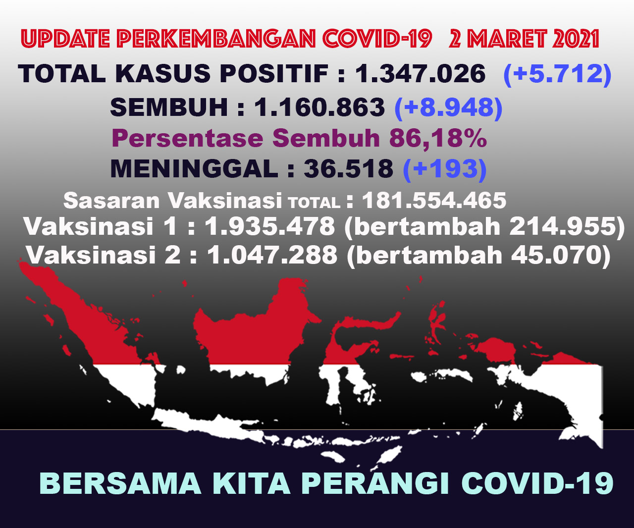 (Vibizmedia – Nasional) Berikut adalah angka akumulatif perkembangan data kasus Covid-19 dari seluruh Indonesia hingga tanggal 2 Maret 2021.