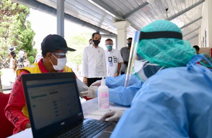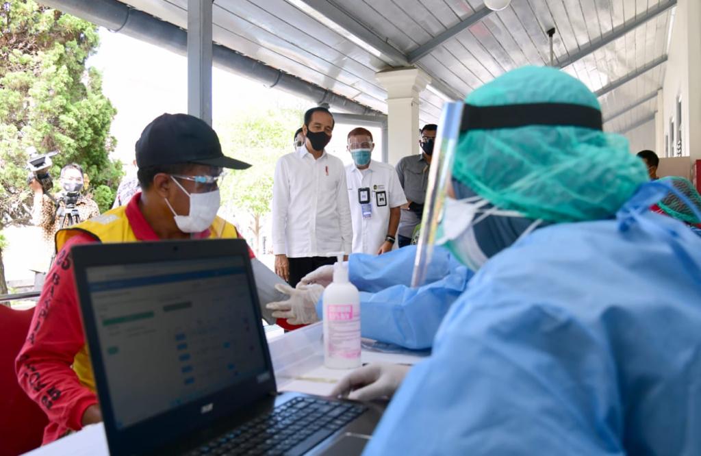 Presiden Joko Widodo meninjau vaksinasi massal bagi pedagang dan penjaga toko di Museum Benteng Vredeburg Yogyakarta. FOTO: BIRO PERS SETPRES