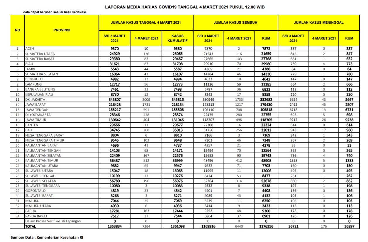 Berikut rincian kasus positif per provinsi per tanggal 4 Maret 2021: