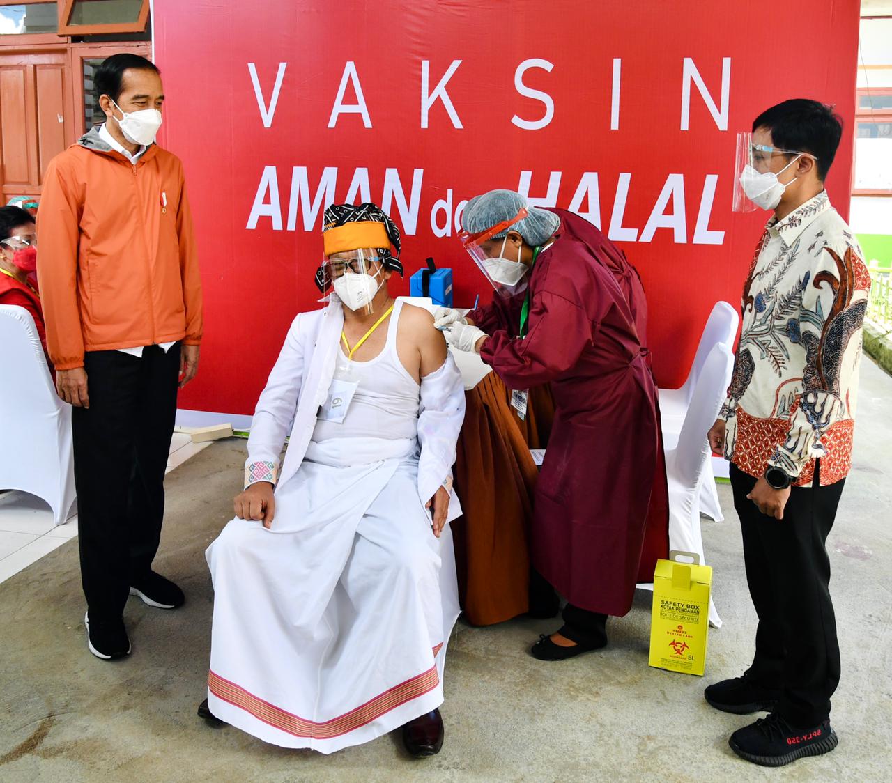 “Saya berkunjung dalam rangka melihat proses vaksinasi yang ada di sini. Jadi hari ini dalam proses dikerjakan untuk 11.000 masyarakat yang sebelumnya juga sudah berjalan untuk 6.000 orang sehingga totalnya ada 17.000,” jelas Presiden saat memberikan keterangan selepas peninjauan.