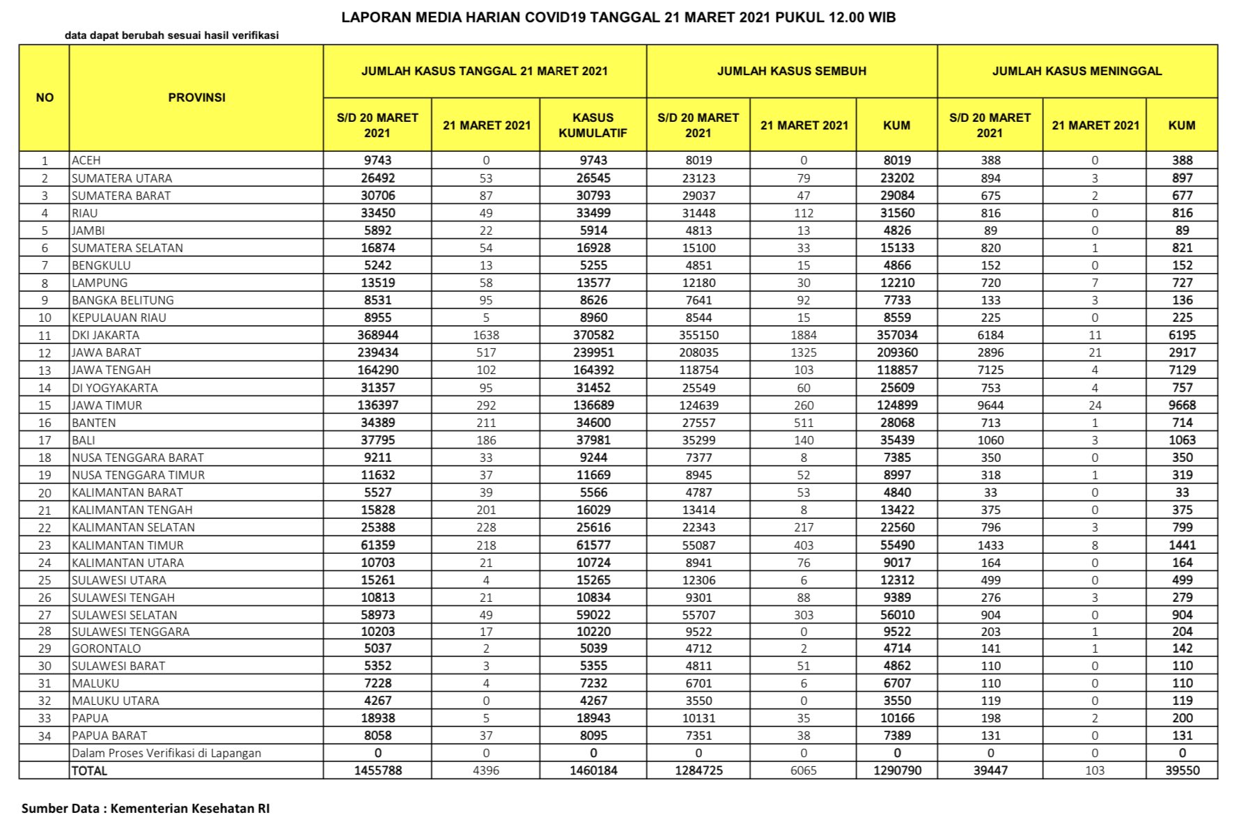 Berikut adalah data COVID-19 di seluruh provinsi pada tanggal 21 Maret 2021: