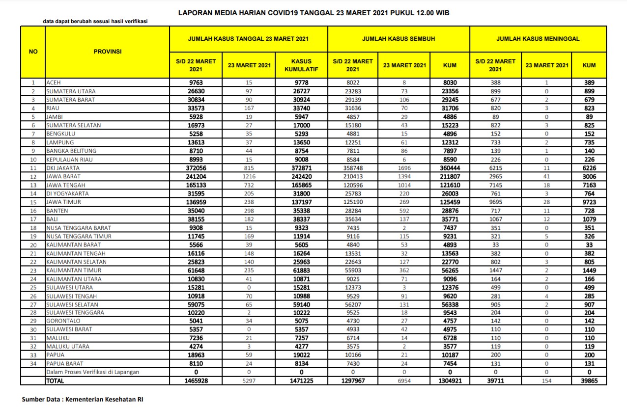 Berikut rincian kasus positif per provinsi per tanggal 23 Maret 2021:
