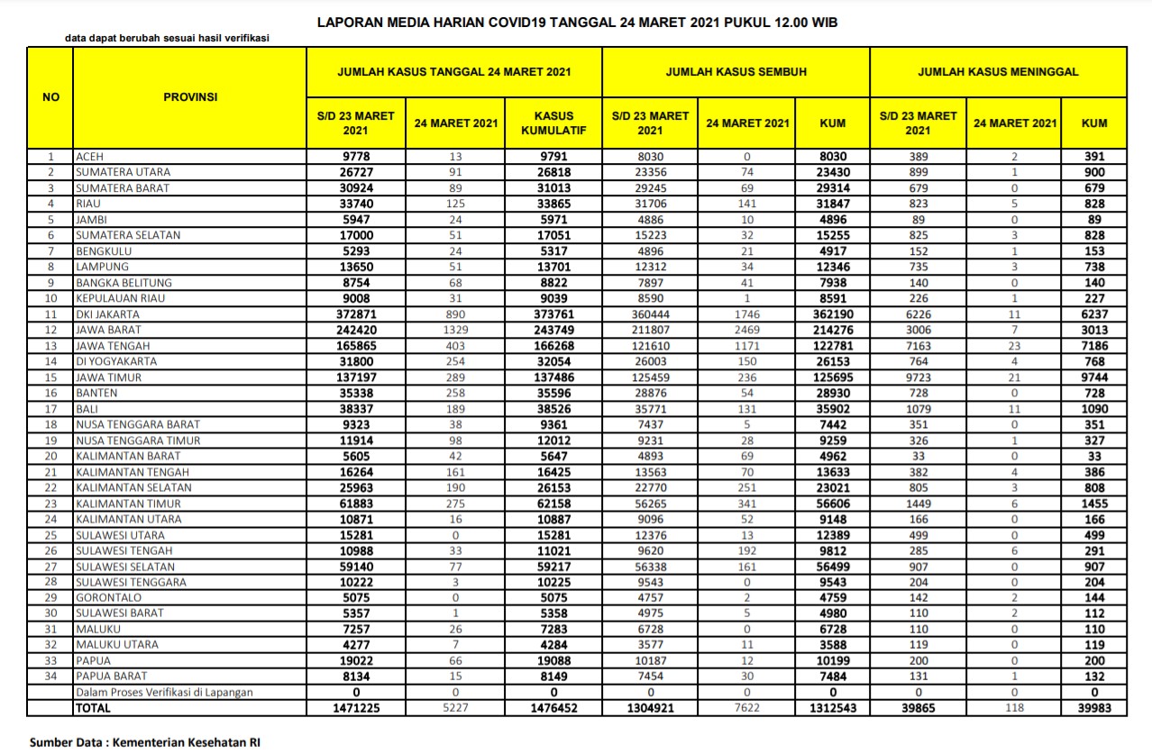 Berikut rincian kasus positif per provinsi per tanggal 24 Maret 2021: