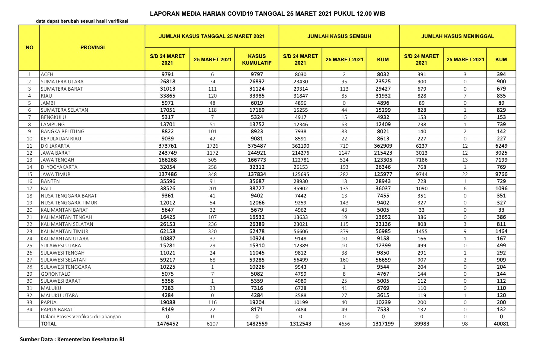 Berikut adalah data COVID-19 di seluruh provinsi pada tanggal 25 Maret 2021: