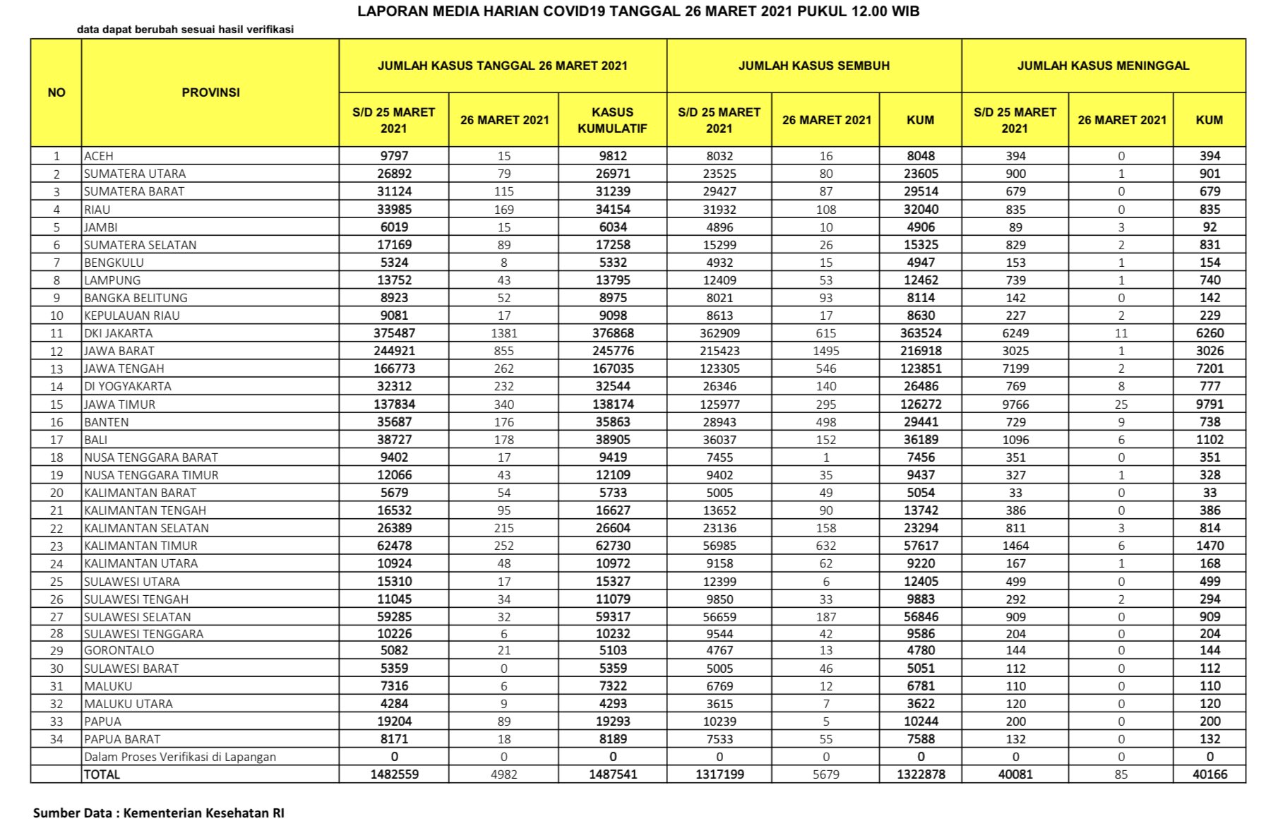 Berikut rincian kasus positif per provinsi per tanggal 26 Maret 2021: