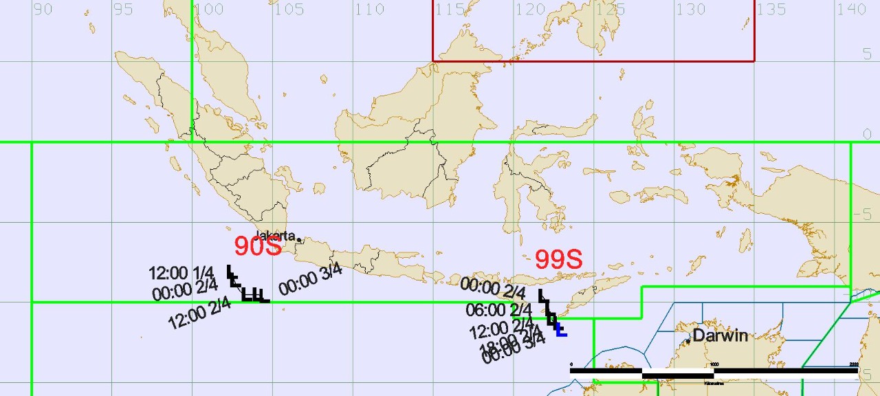 (Vibizmedia-Nasional) Badan Meteorologi Klimatologi dan Geofisika (BMKG) sebagai Tropical Cyclone Warning Center (TCWC) Jakarta mendeteksi adanya adanya 2 (dua) bibit siklon tropis, yaitu Bibit Siklon Tropis 90S di Samudra Hindia barat daya Sumatra dan Bibit Siklon Tropis 99S di Laut Sawu, Nusa Tenggara Timur, Sabtu (3/4).