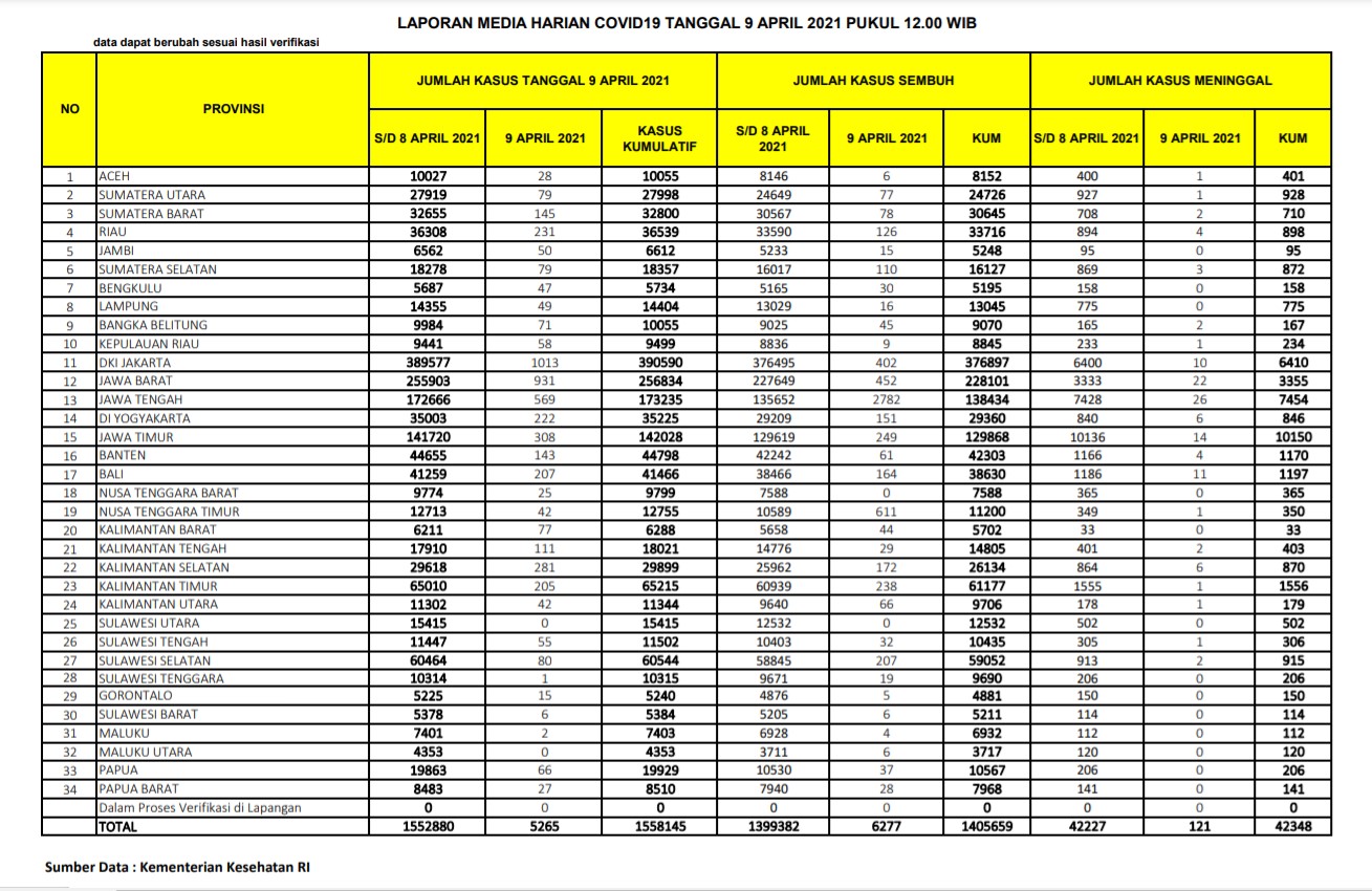 Berikut adalah data COVID-19 di seluruh provinsi pada tanggal 9 April 2021: