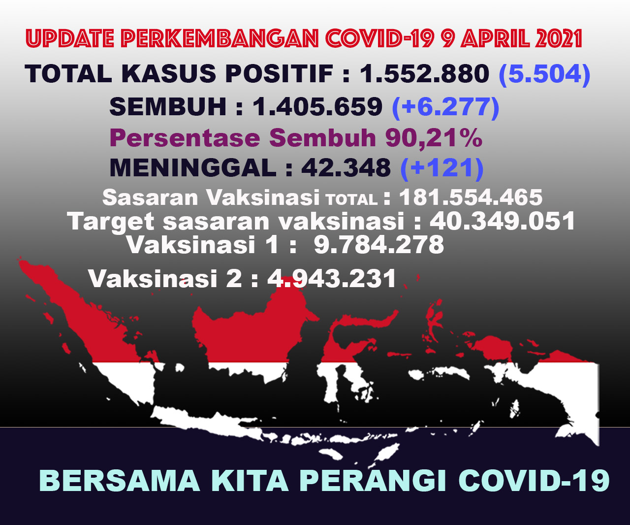 (Vibizmedia – Nasional) Berikut adalah angka akumulatif perkembangan data kasus Covid-19 dari seluruh Indonesia hingga tanggal 9 April 2021.