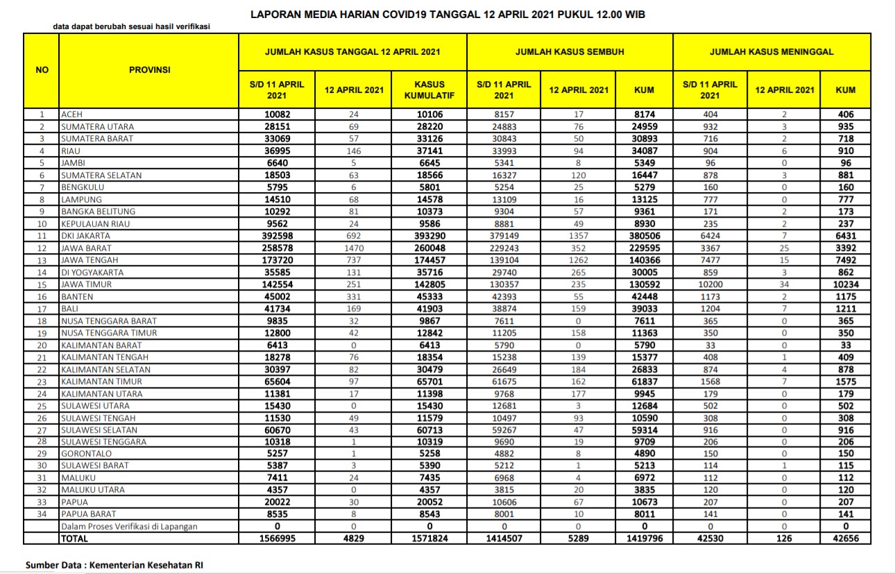 Berikut adalah data COVID-19 di seluruh provinsi pada tanggal 12 April 2021: