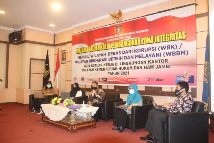 (Vibizmedia -Nasional) Jambi, Rabu (21-04-2021) memasuki hari kedua evaluasi satuan kerja pembangunan Zona Integritas menuju WBK/WBBM pada satuan kerja Kantor Wilayah Kementerian Hukum dan HAM Jambi Tahun 2021. Tim dari Inspektorat Jenderal Kementerian Hukum dan HAM melakukan penilaian terhadap Kantor Wilayah Kementerian Hukum dan HAM Jambi.