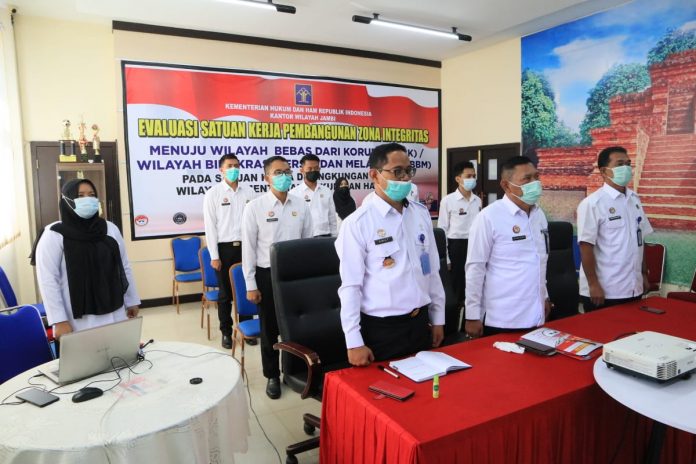 (Vibizmedia – Nasional) JAMBI – Rabu, 21 April 2021 Guna mewujudkan Sumber Daya Manusia Aparatur Sipil Negara (ASN) yang berintegritas tinggi dan mengamalkan nilai Profesional, Akuntabel, Sinergi, Transparan, dan Inovatif (PASTI), maka Badan Pengembangan Sumber Daya Manusia (BPSDM) Hukum dan Hak Asasi Manusia bekerja sama dengan Lembaga Administrasi Negara (LAN) Republik Indonesia mengadakan Pelatihan Dasar (Latsar) bagi Calon Pegawai Negeri Sipil (CPNS) Tahun Anggaran 2021 dan dibuka secara serentak oleh Menteri Hukum dan Hak Asasi Manusia Yasonna H. Laoly yang dalam hal ini diwakili oleh Sekretaris Jenderal Kemenkumham RI Komjen Pol. Andap Budhi Revianto. Turut hadir pula dalam kegiatan Pembukaan Latsar CPNS Tahun Anggaran 2021 yakni Kepala Lembaga Administrasi Negara Republik Indonesia Adi Suryanto, Kepala Badan Pengembangan Sumber Daya Manusia Hukum dan Hak Asasi Manusia Asep Kurnia, Para Pimpinan Tinggi Madya dan Para Pimpinan Tinggi Pratama di lingkungan Kementerian Hukum dan HAM dan LAN, serta Kepala Kantor Wilayah (Kakanwil) Kementerian Hukum dan HAM Jambi Mhd. Jahari Sitepu, Kepala Divisi Administrasi Slamet Pramoedji, Kepala Bagian Umum Amat Djoemadi, dan Kepala Sub. Bagian Kepegawaian, Tata Usaha, dan Rumah Tangga Efra Wahyuni, dan para CPNS di Lingkungan Kantor Wilayah Jambi.