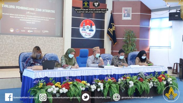 (Vibizmedia – Nasional) Gorontalo – Kamis (22/4) Hari ini adalah hari pertama dimana seluruh jajaran Kanwil Kementerian Hukum dan HAM Gorontalo baik ditingkat Wilayah dan Unit Pelaksana Teknis (UPT) laksanakan evaluasi dari Tim Penilai Internal (TPI) Inspektur Jendral Kementerian Hukum dan HAM. Bertempat di Aula Kanwil, Kepala Kantor Wilayah (Hantor Situmorang) membuka Entry Meeting Evaluasi TPI Itjen Kemenkumham Gorontalo. Kakanwil mengucapkan selamat datang kepada TPI di Provinsi Gorontalo. Pada acara yang Entry Meeting yang dilaksanakan secara terpisah baik secara langsung dan virtual oleh seluruh UPT kakanwil juga menyampaikan seluruh jajaran untuk memaparkan dengan baik apa yang telah dipersiapkan dengan matang selama ini. Selanjutnya kakanwil mempersilahkan tim dari ITJEN untuk memaparkan terkait evaluasi pembangungan zona integritas.