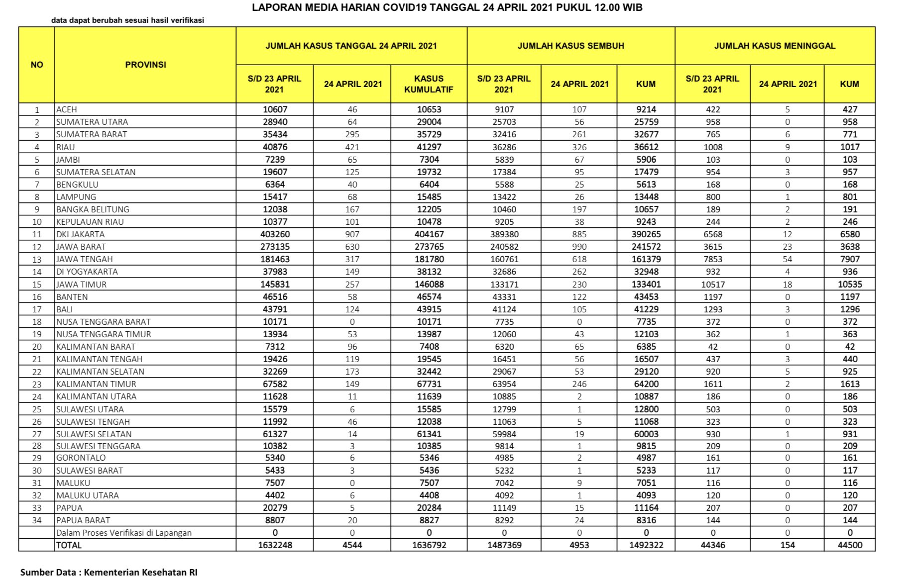 Berikut adalah data COVID-19 di seluruh provinsi pada tanggal 24 April 2021: