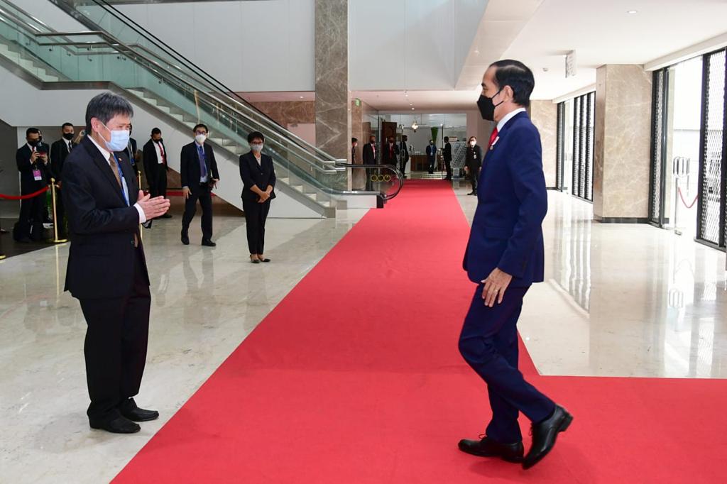 (Vibizmedia-Nasional) Presiden Joko Widodo tiba di Sekretariat ASEAN dalam rangka menghadiri ASEAN Leaders’ Meeting, Jakarta, pada Sabtu siang, 24 April 2021. Kehadiran Presiden tersebut, disambut langsung oleh Sekretariat Jenderal ASEAN Dato Lim Jock Hoi.