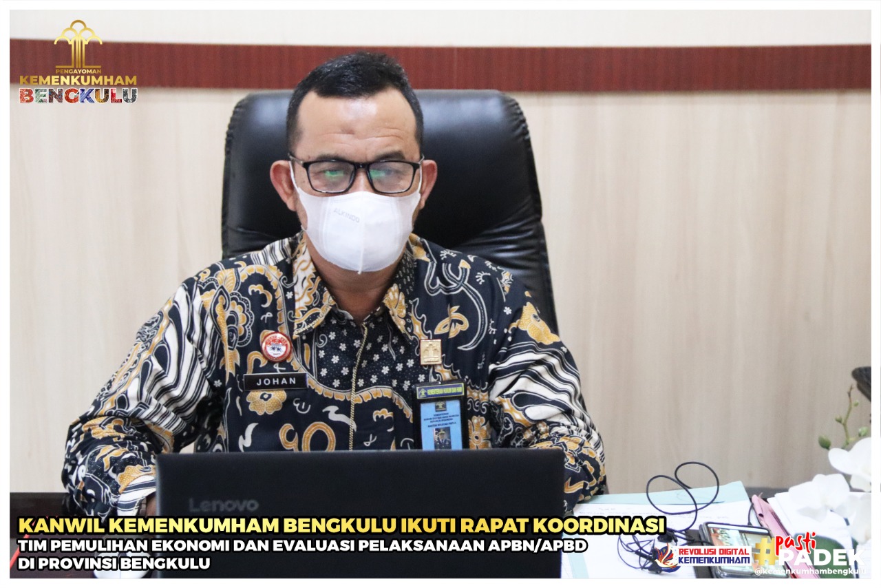 (Vibizmedia – Nasional) BENGKULU – Menindaklanjuti surat keputusan Gubernur Bengkulu Nomor A.276.B.3 Tahun 2020 tentang pembentukan tim terpadu pemulihan ekonomi dalam rangka penanganan dampak Covid-19 DI Provinsi Bengkulu, Kanwil Kemenkumham Bengkulu mengikuti kegiatan rapat koordinasi tim pemulihan ekonomi dan evaluasi pelaksanaan APBN/APBD di Provinsi Bengkulu, Kamis (22/4/2021). Turut hadir secara virtual Kepala Divisi Administrasi (Johan Manurung) mewakili Kakanwil Kemenkumham Bengkulu.