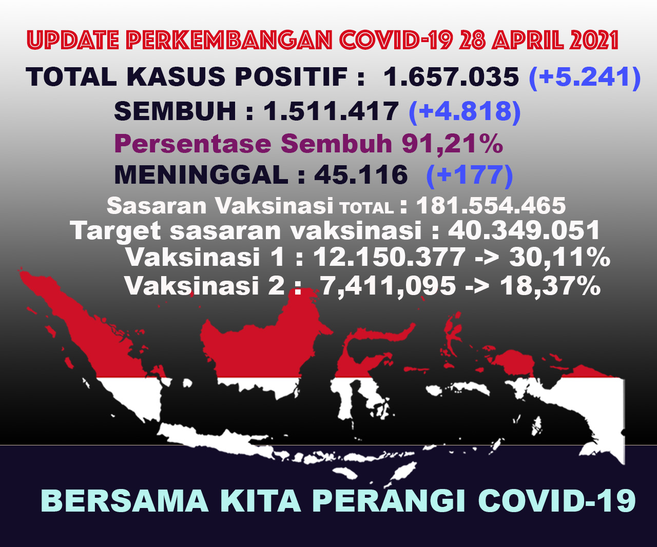 (Vibizmedia – Nasional) Berikut adalah angka akumulatif perkembangan data kasus Covid-19 dari seluruh Indonesia hingga tanggal 28 April 2021.
