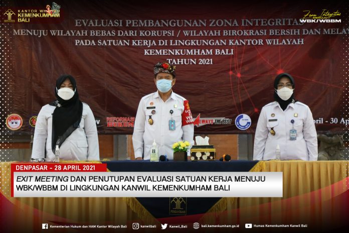 (Vibizmedia – Nasional) DENPASAR – Rabu, 28 April 2021 bertempat di Ruang Aula Dharmawangsa Kantor Wilayah Kementerian Hukum dan HAM Bali, dilaksanakan kegiatan Exit Meeting Evaluasi Pembangunan Zona Integritas Menuju Wilayah Bebas dari Korupsi (WBK) dan Wilayah Birokrasi Bersih dan Melayani (WBBM) oleh Tim Penilai Internal dari Inspektorat Jenderal Kementerian Hukum dan Hak Asasi Manusia RI.