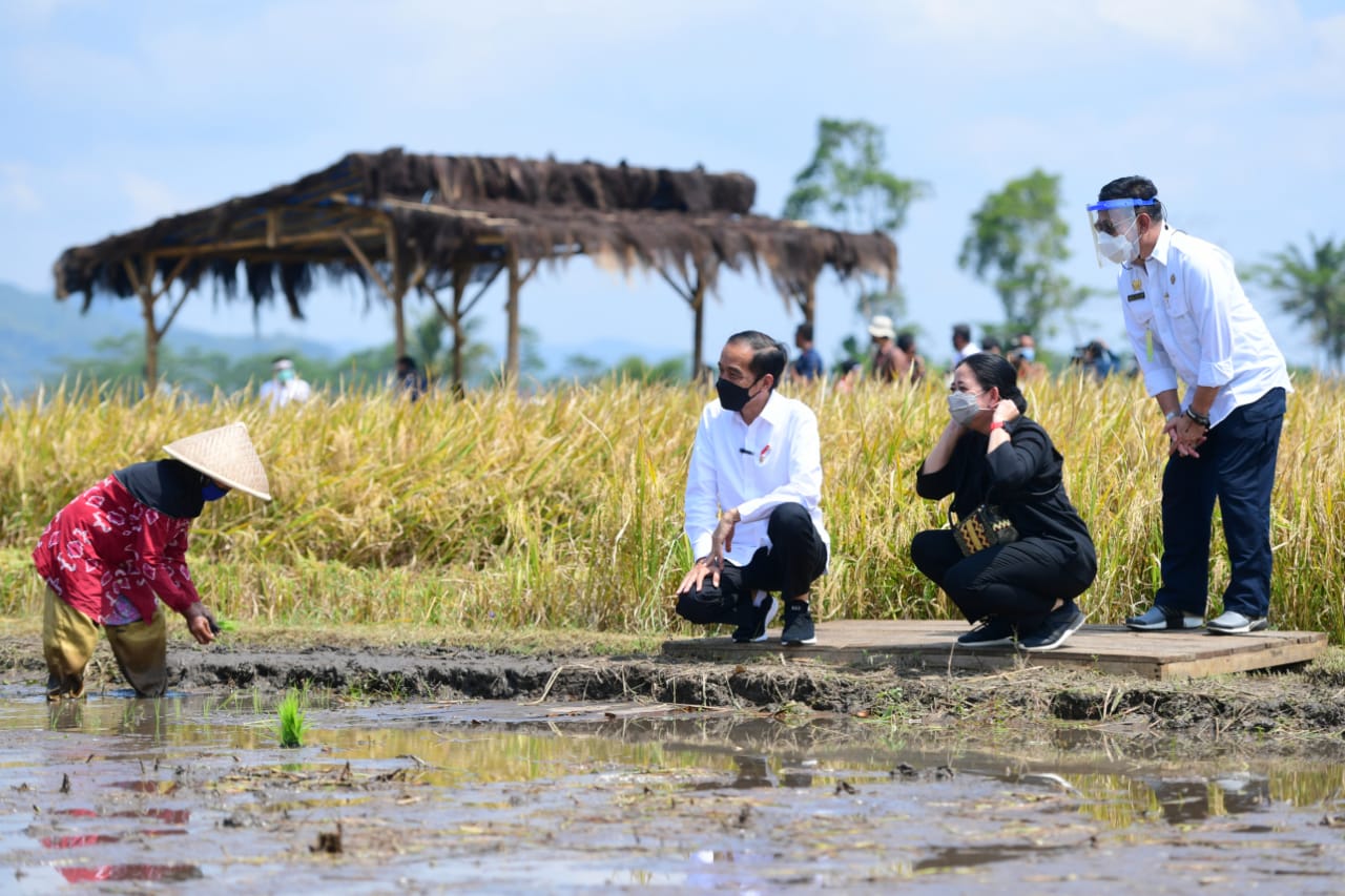 “Saya bersama dengan Ibu Puan Maharani Ketua DPR RI, dan juga para menteri, gubernur, dan bupati untuk memastikan bahwa produksi padi yang ada, panen yang ada, betul-betul bisa memenuhi kebutuhan seluruh rakyat Indonesia,” ujar Presiden dalam keterangannya di lokasi seusai peninjauan.