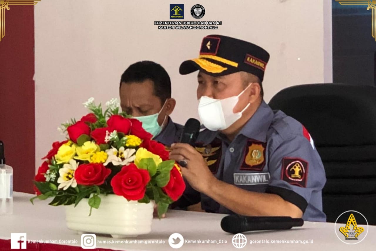 Didampingi Kepala Bidang Pembinaan, Bimbingan dan TI (Tjahja Rediantara) dan Kepala Bidang Pelayanan Tahanan, BASAN dan Keamanan (Yopy W. Sumarauw), Kepala Kantor Wilayah memberikan arahan kepada para Petugas Pemasyarakatan di Lapas Kelas IIB Pohuwato.