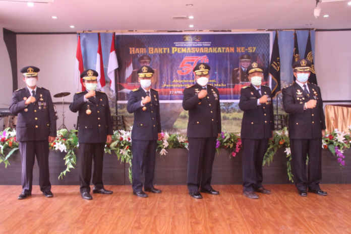 (Vibizmedia – Nasional) PALU – Selasa (27/04/2021), Kepala Kantor Wilayah Kementerian Hukum dan Hak Asasi Manusia Sulawesi Tengah (Kakanwil Kemenkumham Sulteng), Lilik Sujandi, didampingi para Kepala Divisi Kantor Wilayah dan Pejabat Struktural pada Divisi Pemasyarakatan mengikuti Upacara Hari Bakti Pemasyarakatan (HBP) ke-57 Tahun 2021 secara virtual bertempat di aula Kasiromu, sedangkan untuk jajaran UPT Pemasyarakatan se-Sulawesi Tengah mengikuti upacara secara virtual dari tempat masing-masing.