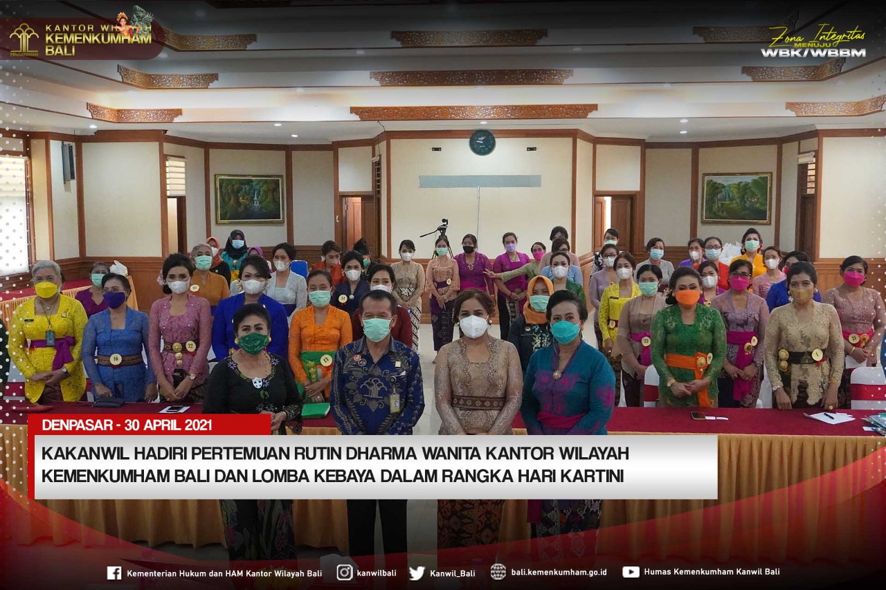 (Vibizmedia – Nasional) DENPASAR – Jumat, 30 April 2021 bertempat di Ruang Aula Dharmawangsa Kementerian Hukum dan Hak Asasi Manusia Bali diadakan kegiatan Pertemuan Rutin Dharma Wanita Persatuan Kantor Wilayah Kementerian Hukum dan HAM Bali serta Lomba Kebaya memperingati Hari Kartini Tahun 2021 dengan tema Menjadi Wanita Hebat Dimana Saja dan Setiap Saat. Kegiatan dihadiri oleh Kepala Kantor Wilayah Kemenkumham Bali (Jamaruli Manihuruk), Ketua Dharma Wanita Kantor Wilayah Kemenkumham Bali (Ny. Cahaya Manihuruk), serta anggota Dharma Wanita Kantor Wilayah Kemenkumham Bali. Kegiatan diawali dengan sambutan dari Ibu Kakanwil selaku Ketua Dharma Wanita Kantor Wilayah Kemenkumham Bali yang menyampaikan bahwa dengan dilaksanakannya kegiatan ini sesuai dengan tema Menjadi Wanita Hebat Dimana Saja dan Setiap Saat diharapkan kepada para wanita agar terbebas dari tekanan serta hambatan untuk bisa maju sebagai bentuk emansipasi wanita di era modern saat ini. “Selamat Hari Kartini, Selamat menjadi Wanita Tangguh!”, tutup beliau.