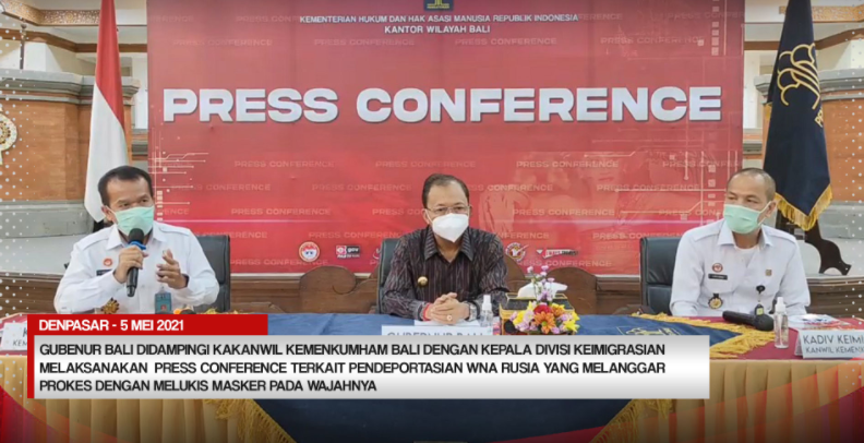(Vibizmedia – Nasional) DENPASAR – Rabu, 05 Mei 2021 bertempat di Ruang Aula Dharmawangsa Kementerian Hukum dan Hak Asasi Manusia Bali diadakan Press Conference terkait Tindakan Tegas Terhadap Warga Negara Rusia yang Telah Melanggar Protokol Kesehatan dengan Melukis Masker pada Wajah. Kepala Kantor Wilayah Kementerian Hukum dan Hak Asasi Manusia Bali (Jamaruli Manihuruk) mendampingi Gubernur Provinsi Bali (Wayan Koster) bersama Kepala Divisi Imigrasi Kementerian Hukum dan HAM Bali (Amrizal) untuk memberikan keterangan kepada media online, media cetak, maupun media telivisi yang diundang untuk hadir dalam Press Conference ini. Hadir juga dalam kesempatan tersebut kepala Kantor Imigrasi Ngurah Rai, Kapolres Kabupaten Badung, Kepala Satuan Polisi Pamong Praja Provinsi Bali, dan Kepala Dinas Komunikasi, Informasi dan Statistika Provinsi Bali.