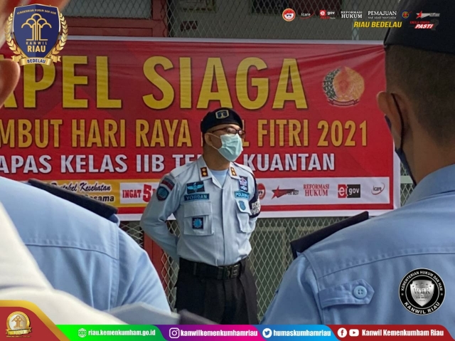 (Vibzmedia – Nasional) Pekanbaru – Jelang Hari Raya Idul Fitri 1442 Hijriah yang tinggal beberapa hari lagi, Unit Pelaksana Teknisi (UPT) Pemasyarakatan di lingkungan Kanwil Kemenkumham Riau menggelar Apel Siaga dengan melibatkan seluruh petugas, baik petugas pengamanan maupun petugas kantor, Selasa (11/5). Apel siaga ini dilaksanakan dalam rangka meningkatkan kewaspadaan dan antisipasi gangguan keamanan dan ketertiban di lapas/rutan/rupbasan/bapas di Riau.