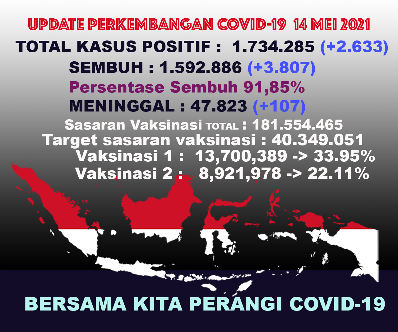 (Vibizmedia – Nasional) Berikut adalah angka akumulatif perkembangan data kasus Covid-19 dari seluruh Indonesia hingga tanggal 14 Mei 2021.