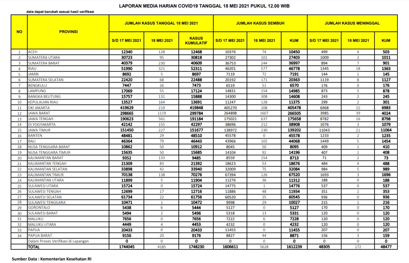 Berikut adalah data COVID-19 di seluruh provinsi pada tanggal 18 Mei 2021: