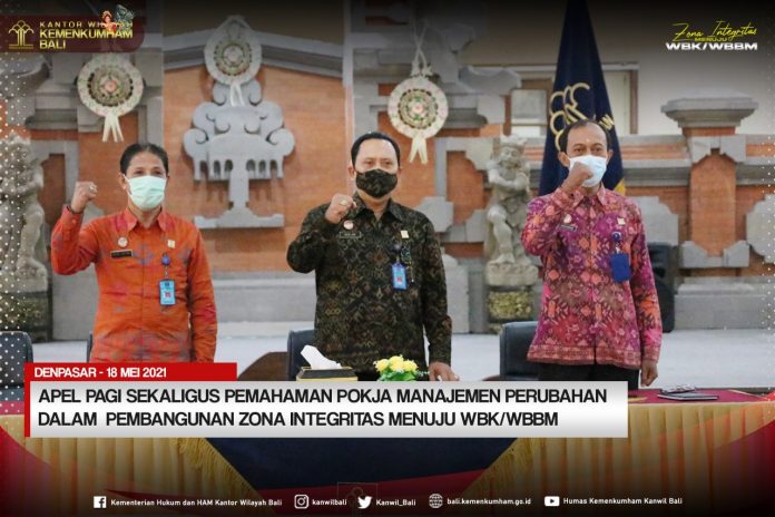 (Vbizmedia – Nasional) DENPASAR – Selasa, 18 Mei 2021 bertempat di Ruang Dharmawangsa Kantor Wilayah Kementerian Hukum dan Hak Asasi Manusia Bali dilaksanakan Internalisasi terkait pembangunan Zona Integritas (ZI) di Kantor Wilayah Kemenkumham Bali untuk menuju Wilayah Bebas Dari Korupsi (WBK) dan Wilayah Birokrasi Bersih dan Melayani (WBBM). Hadir dalam kegiatan tersebut Kepala Kantor Wilayah Kementerian Hukum dan HAM Bali (Jamaruli Manihuruk) dan Pejabat Tinggi Pratama yang hadir secara virtual, serta Kepala Divisi Pelayanan Hukum dan HAM (Constantinus Kristomo), dan Koordinator serta anggota masing-masing tim kelompok kerja (pokja) pembangunan ZI menuju WBK/WBBM yang hadir secara langsung, kegiatan akan rutin dilaksanakan setiap hari sebelum memulai tugas dan diikuti oleh seluruh pegawai yang melaksanakan WFO (Work From Office) maupun pegawai yang sedang WFH (Work From Home) melalui Zoom.