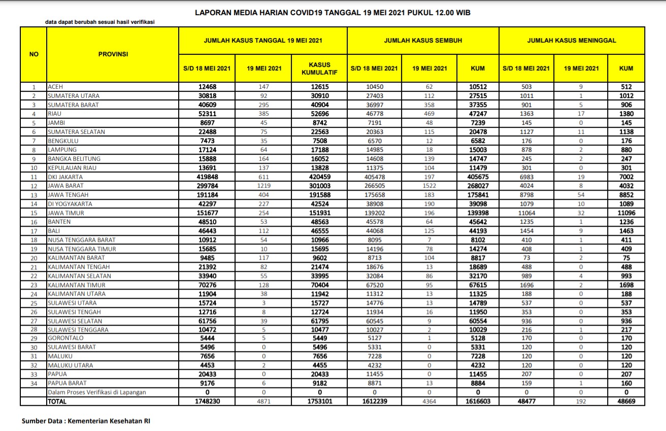 Berikut adalah data COVID-19 di seluruh provinsi pada tanggal 19 Mei 2021:
