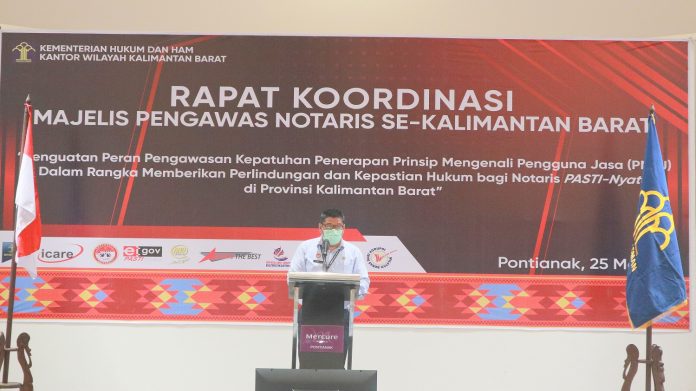 (Vibizmedia -Nasional) Pontianak – Kepala Kantor Wilayah Kementerian Hukum dan HAM Kalimantan Barat, Fery Monang Sihite, membuka Rapat Koordinasi Majelis Pengawas Notaris Kalimantan Barat di Sky Cendana Ball Room Lt.9 Hotel Mercure Pontianak yang mengusung tema “Penguatan Peran Pengawasan Kepatuhan Penerapan Prinsip Mengenali Pengguna Jasa (PMPJ) dalam rangka Memberikan Perlindungan dan Kepastian Hukum bagi Notaris PASTI-Nyata di Provinsi Kalimantan Barat”. Kegiatan Rakor juga dihadiri oleh Kepala Divisi Administrasi, Anggiat Ferdinan, Kepala Divisi Keimigrasian, Pamuji Raharja, Kepala Divisi Pelayanan Hukum dan HAM, Toman Pasaribu, perwakilan Direktur Perdata Ditjen AHU, perwakilan Ketua Umum Ikatan Notaris Indonesia Pusat, Ketua Pengurus Wilayah Ikatan Notaris Indonesia Kalimantan Barat, Carolina Anggraini.