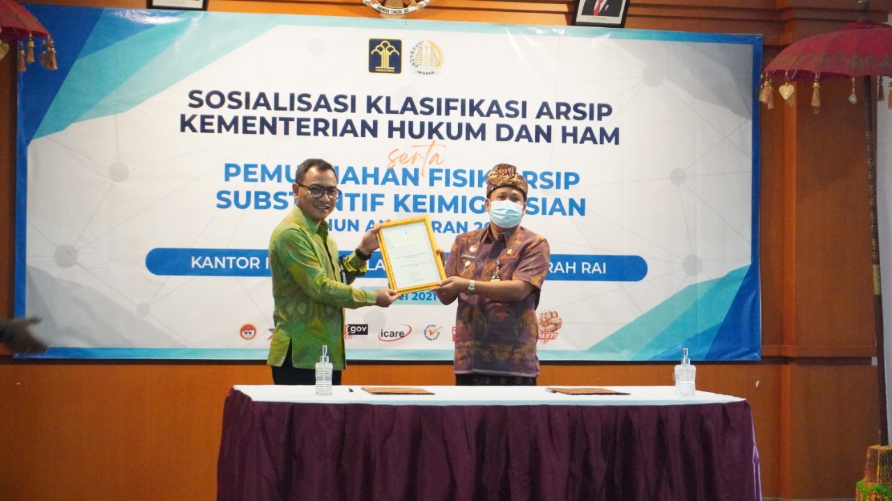 (Vibizmedia – Nasional) DENPASAR – Kamis, 27 Mei 2021 Kepala Divisi Keimigrasian Kementerian Hukum dan HAM Bali (Amrizal) menghadiri kegiatan Sosialisasi Klasifikasi Arsip Kementerian Hukum dan HAM serta Pemusnahan Fisik Arsip Substantif Keimigrasian di Aula Kantor Imigrasi Kelas I Khusus TPI Ngurah Rai. Dalam kesempatan tersebut, dihadiri pula oleh Kepala Bagian Tata Usaha Kementerian Biro Umum Sekretariat jenderal Kementerian Hukum dan HAM (Alkana Yudha), Kepala Kantor Imigrasi Kelas I Khusus TPI Ngurah Rai (I Nyoman Gede Surya Mataram), Kepala Kantor Imigrasi Kelas I Khusus Denpasar (Tedy Riyandi), dan Para Pejabat Struktural Kantor Imigrasi Kelas I Khusus TPI Ngurah Rai, serta undangan lainnya.