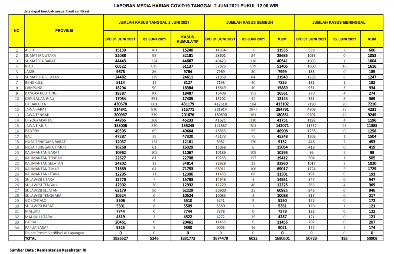 (Vibizmedia – Nasional) Berikut adalah angka akumulatif perkembangan data kasus Covid-19 dari seluruh Indonesia hingga tanggal 2 Juni 2021.