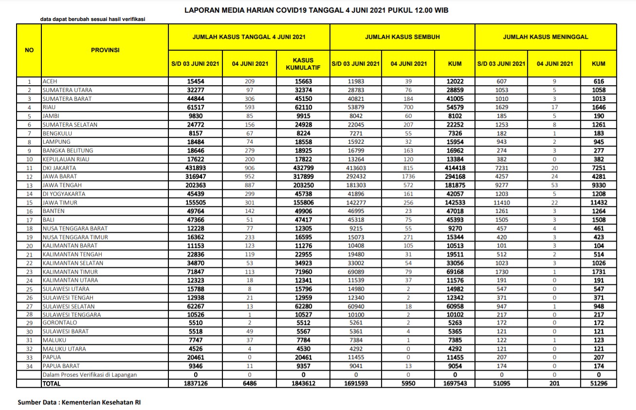(Vibizmedia – Nasional) Berikut adalah angka akumulatif perkembangan data kasus Covid-19 dari seluruh Indonesia hingga tanggal 4 Juni 2021.