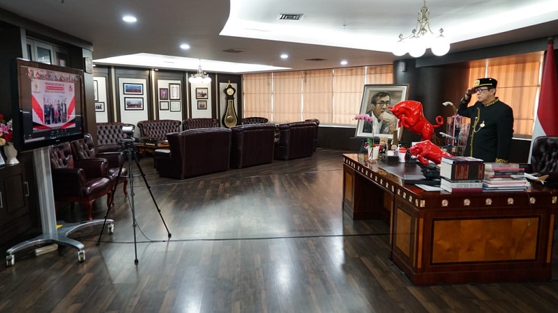 (Vibizmedia – Nasional)  Jakarta – Upacara Peringatan Hari Lahir Pancasila yang digaungkan setiap 1 Juni, untuk dua tahun terakhir dilakukan secara daring. Mengenakan busana adat dari Kutai Kartanegara, Kalimantan Timur, Menteri Hukum dan Hak Asasi Manusia (Menkumham), Yasonna H. Laoly hadir mengikuti jalannya upacara dari kantor Kementerian Hukum dan Hak Asasi Manusia (Kemenkumham).