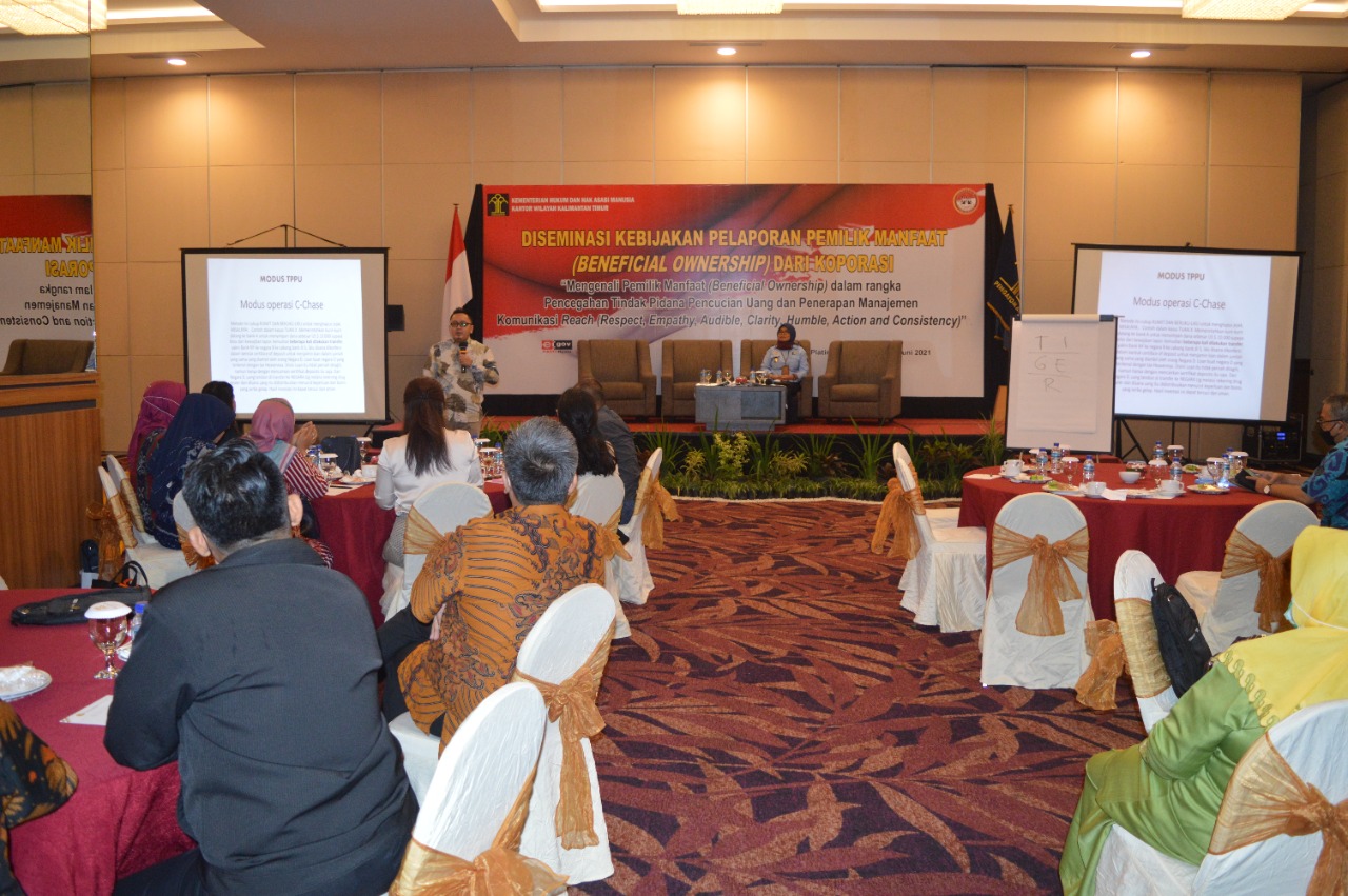 Dalam rangka mendukung upaya pencegahan dan pemberantasan anti pencucian uang dan atau pencegahan pendanaan terorisme serta meningkatkan jumlah korporasi yang melaporkan pemilik manfaatnya (Beneficial Ownership) ke sistem AHU Online, Kantor Wilayah Kementerian Hukum dan Hak Asasi Manusia Kaltim menyelenggarakan kegiatan Diseminasi Kebijakan Mengenai Pelaporan Pemilik Manfaat Korporasi (Beneficial Ownership) di Hotel Platinum, Balikpapan.