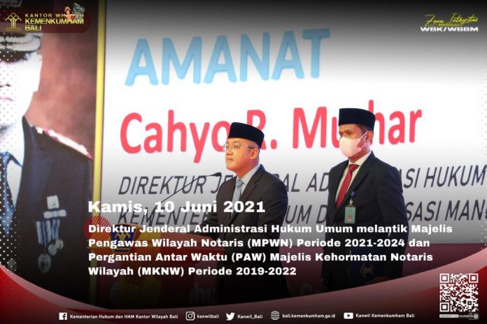 (Vibizmedia – Nasional) BADUNG – Kamis, 10 Juni 2021 bertempat di Ballroom Hotel Grand Hyatt Nusa Dua, Kepala Kantor Wilayah Kementerian Hukum dan HAM Bali (Jamaruli Manihuruk) bersama 32 (tiga puluh dua) Kepala Kantor Wilayah Kementerian Hukum dan HAM di seluruh Indonesia, dan Kepala Divisi Pelayanan Hukum dan HAM Bali (Constantinus Kristomo) bersama 32 (tiga puluh dua) Kepala Divisi Pelayanan Hukum dan HAM lainnya dilantik menjadi Majelis Pengawas Wilayah Notaris Periode Tahun 2021 – 2024 dan Pergantian Antar Waktu (PAW) Majelis Kehormatan Notaris Wilayah (MKNW) Periode Tahun 2019 – 2022 oleh Direktur Jenderal Administrasi Hukum Umum Kementerian Hukum dan HAM RI (Cahyo R. Muzar). Hadir pula dalam kesempatan tersebut Pimpinan Tinggi Pratama Unit Pusat dan Kantor Wilayah seluruh Indonesia, Wakil Direktur Utama PT Bank Mandiri, Kepala Biro Hukum Sekretariat Provinsi Bali yang mewakili Gubernur Bali, serta Pengawas Pusat Notaris.