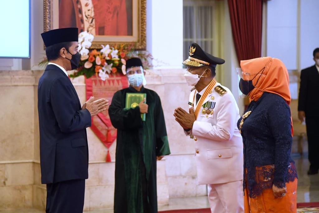 (Vibizmedia-Nasional) Presiden Joko Widodo dengan menerapkan protokol kesehatan secara ketat resmi melantik pasangan Rusdy Mastura sebagai Gubernur Sulawesi Tengah dan Ma’mun Amir sebagai Wakil Gubernur Sulawesi Tengah terpilih masa jabatan tahun 2021-2024 di Istana Negara, Jakarta, pada Rabu, 16 Juni 2021.