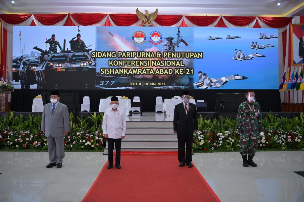 “Menghadapi kasus global yang belum menunjukkan penurunan secara signifikan, maka peran sektor pertahanan dan keamanan menjadi semakin penting untuk diperkuat. Berbagai kemungkinan harus mampu diantisipasi untuk melindungi segenap bangsa, negara, dan seluruh warganya,” tegas Wakil Presiden (Wapres) K. H. Ma’ruf Amin pada acara Penutupan Konferensi Nasional Sistem Pertahanan dan Keamanan Rakyat Semesta (Sishankamrata) Abad ke-21 di Universitas Pertahanan Sentul, Bogor, Jumat (18/6/2021).