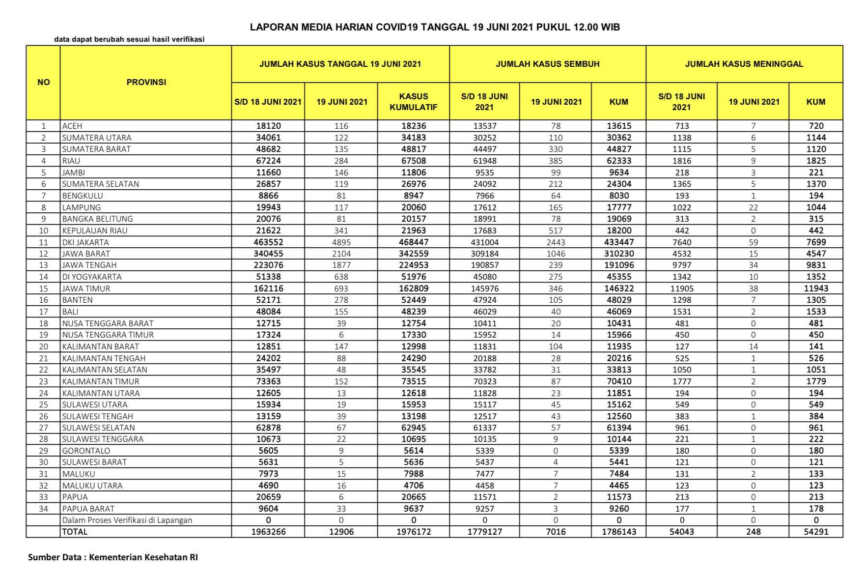 Berikut adalah data COVID-19 di seluruh provinsi pada tanggal 19 Juni 2021: