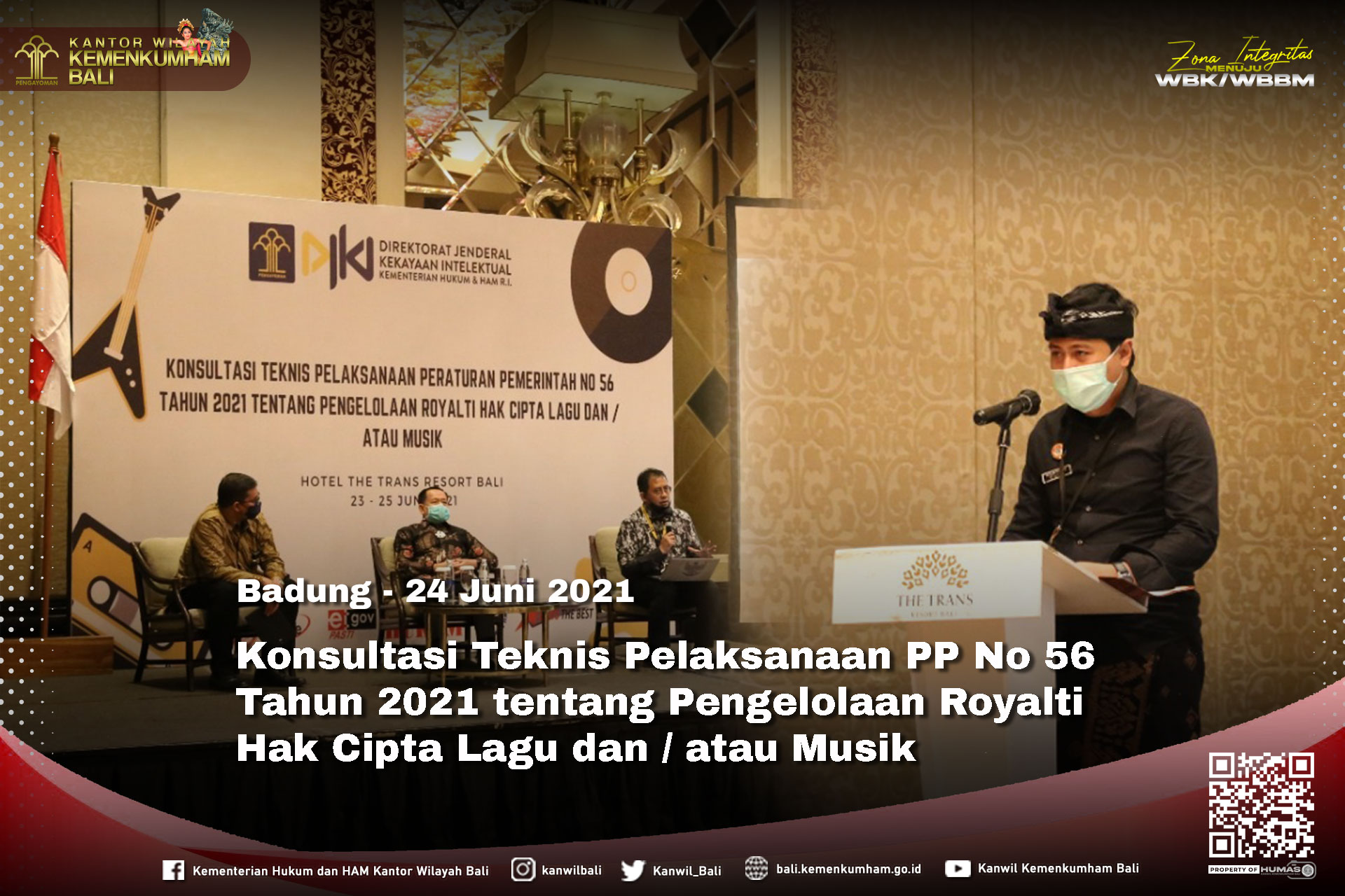 (Vibizmedia – Nasional) BADUNG – Kamis, 24 Juni 2021 Bertempat di Trans Resort Bali dilaksanakan Kegiatan Konsultasi Teknis Rancangan Peraturan Pemerintah Nomor 56 Tentang Pengelolaan Royalti Hak Cipta Lagu dan atau Musik. Kegiatan Konsultasi Teknis ini diselenggarakan oleh Direktorat Jenderal Kekayaan Intelektual Kementerian Hukum dan HAM bekerja sama dengan Kantor Wilayah Kementerian Hukum dan HAM Bali, yang dalam kesempatan tersebut hadir Ketua Lembaga Manajemen Kolektik Nasional (LMKN), Bridgen Pol Purnawirawan Yurod Saleh, Kepala Divisi Pelayanan Hukum dan HAM, Constantinus Kristomo yang dalam hal ini mewakili Kepala Kantor Wilayah Kementerian Hukum dan HAM Bali, Komisioner LMKN Bidang Kolektif Royalti dan Lisensi, Yessy Kurniawan, Penasihat LMKN, Pejabat Administrator dan Pengawas pada Direktorat Jenderal Kekayaan Intelektual dan Kantor Wilayah Kementerian Hukum dan HAM Bali, serta para peserta kegiatan yang berasal dari perwakilan Dinas Pariwisata Provinsi Bali, Dinas Kebudayaan Provinsi Bali, para pelaku seni dan hiburan.
