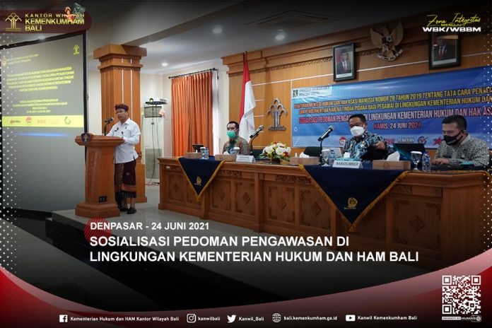 (Vibizmedia -Nasional) DENPASAR – Kamis, 24 Juni 2021 bertempat di Aula Kantor Imigrasi Kelas I TPI Denpasar dilaksanakan kegiatan Sosialisasi Pedoman Pengawasan di Lingkungan Kementerian Hukum dan HAM Bali oleh Inspektorat Jenderal Kementerian Hukum dan HAM. Hadir dalam kesempatan tersebut Kepala Kantor Wilayah Kementerian Hukum dan HAM Bali (Jamaruli Manihuruk), Tim Auditor Inspektorat Wilayah IV Inspektorat Jenderal Kementerian Hukum dan HAM, Pejabat Administrator, serta JFT/JFU Kantor Wilayah dan Kantor Imigrasi Kelas I TPI Denpasar.