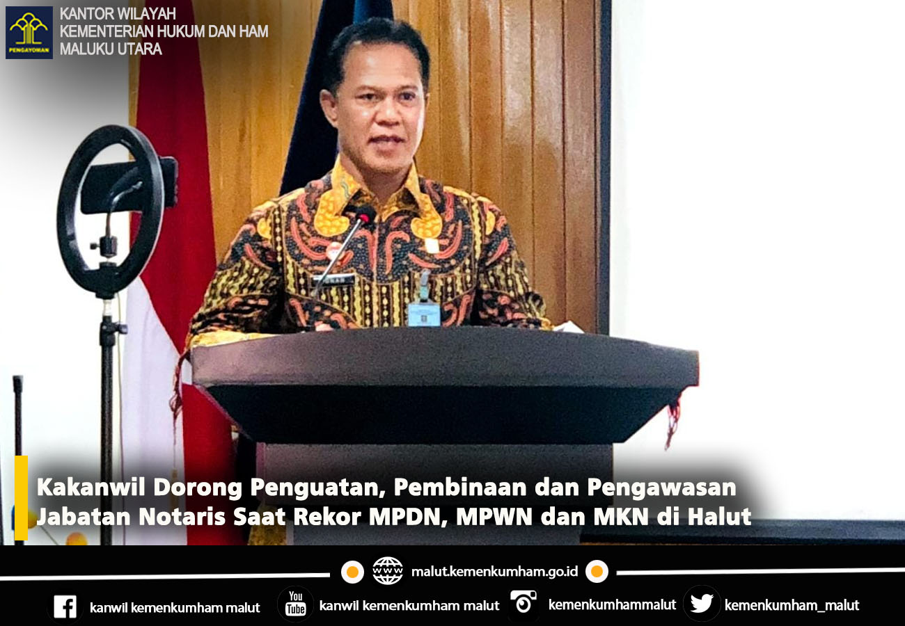 (Vibizmedia – Nasional) Tobelo, malut.kemenkumham.go.id – Kepala Kantor Wilayah (Kakanwil) Kementerian Hukum dan HAM Maluku Utara, M Adnan mendorong penguatan, pembinaan, dan pengawasan jabatan notaris saat menyampaikan sambutan pada Rapat Koordinasi (Rakor) Majelis Pengawas Daerah Notaris (MPDN), Majelis Pengawas Wilayah Notaris (MPWN), dan Majelis Kehormatan Notaris, bertempat di Hotel Greenland, Tobelo, Halmahera Utara, Jumat (25/06/2021).