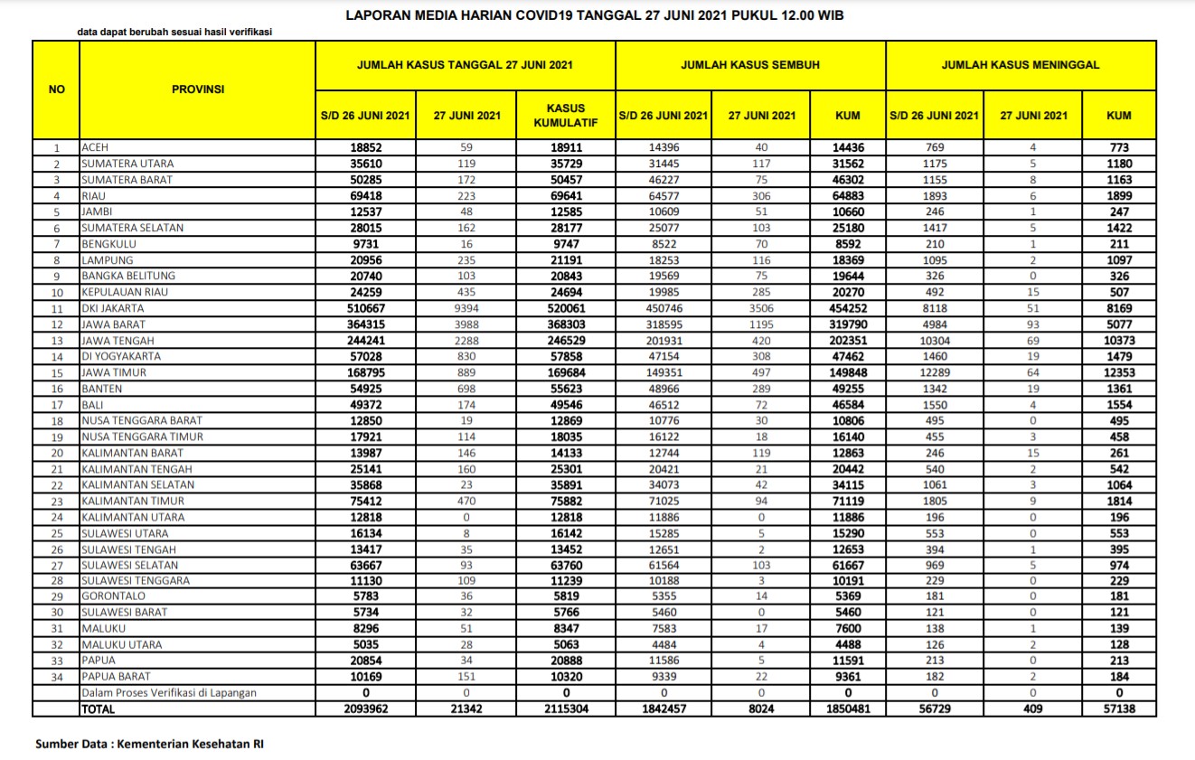 Berikut adalah data COVID-19 di seluruh provinsi pada tanggal 27 Juni 2021: